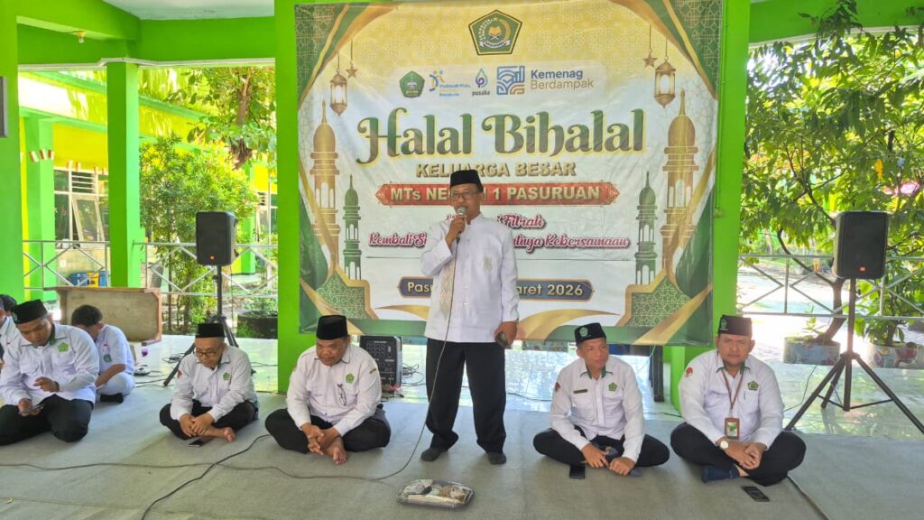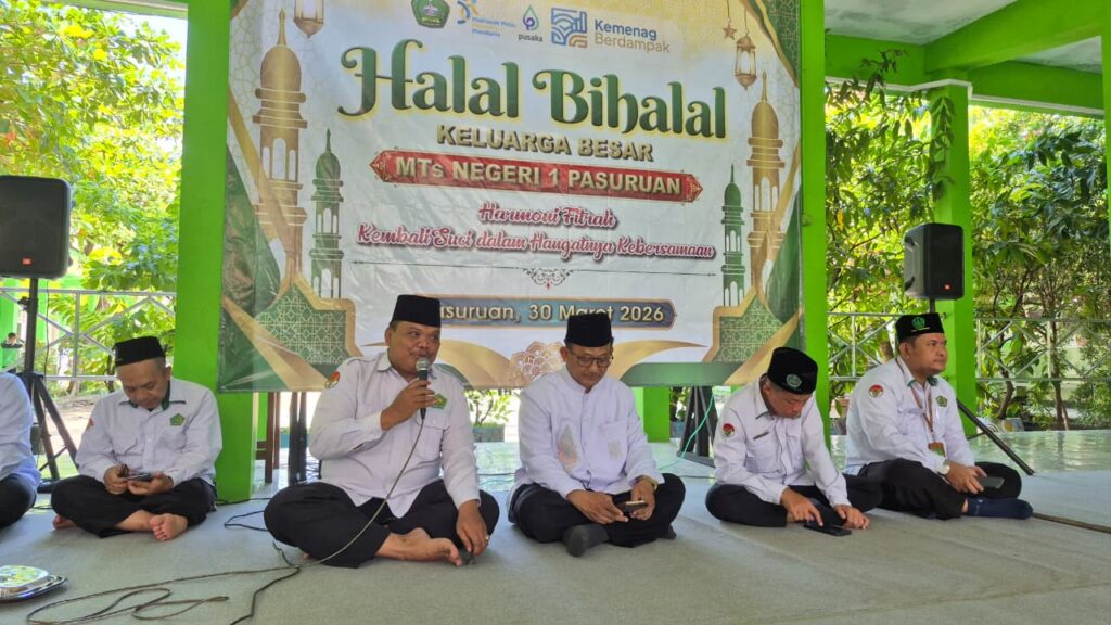 PASURUAN – Suasana penuh kehangatan menyelimuti Musholla MTsN 1 Pasuruan pada Senin, 30 Maret 2026. Seluruh keluarga besar madrasah berkumpul dalam acara Halal Bihalal yang mengusung tema “Harmoni Fitrah: Kembali Suci dalam Hangatnya Kebersamaan.”